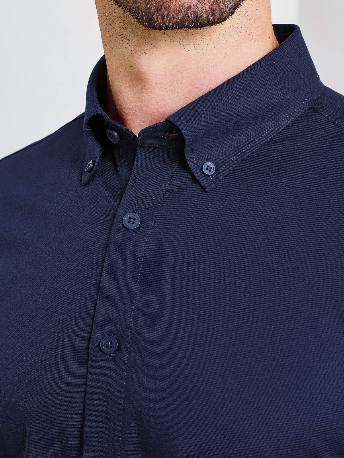 Il colletto button-down mantiene la forma impeccabile, mentre i bottoni tono su tono completano un look sobrio e professionale.