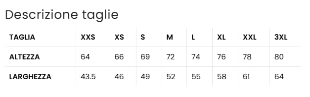 | Taglia | XXS, XS, S, M, L, XL, XXL, XXXL |